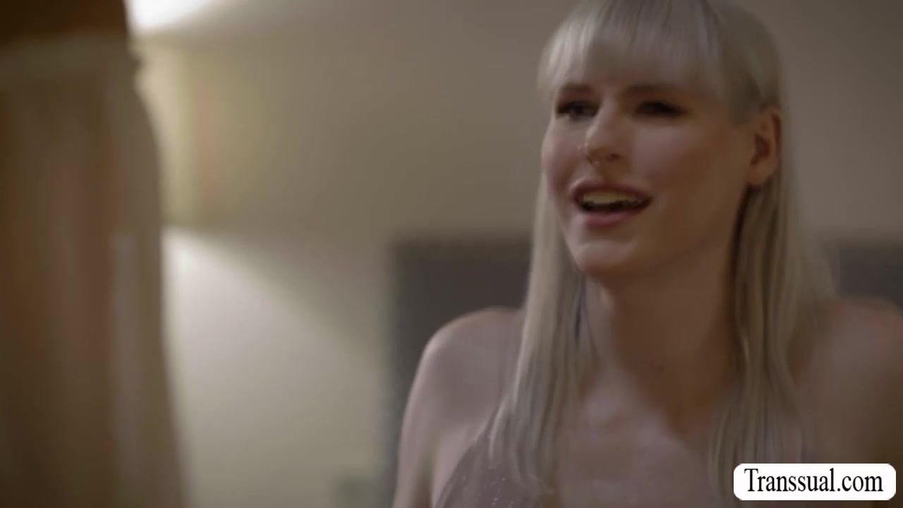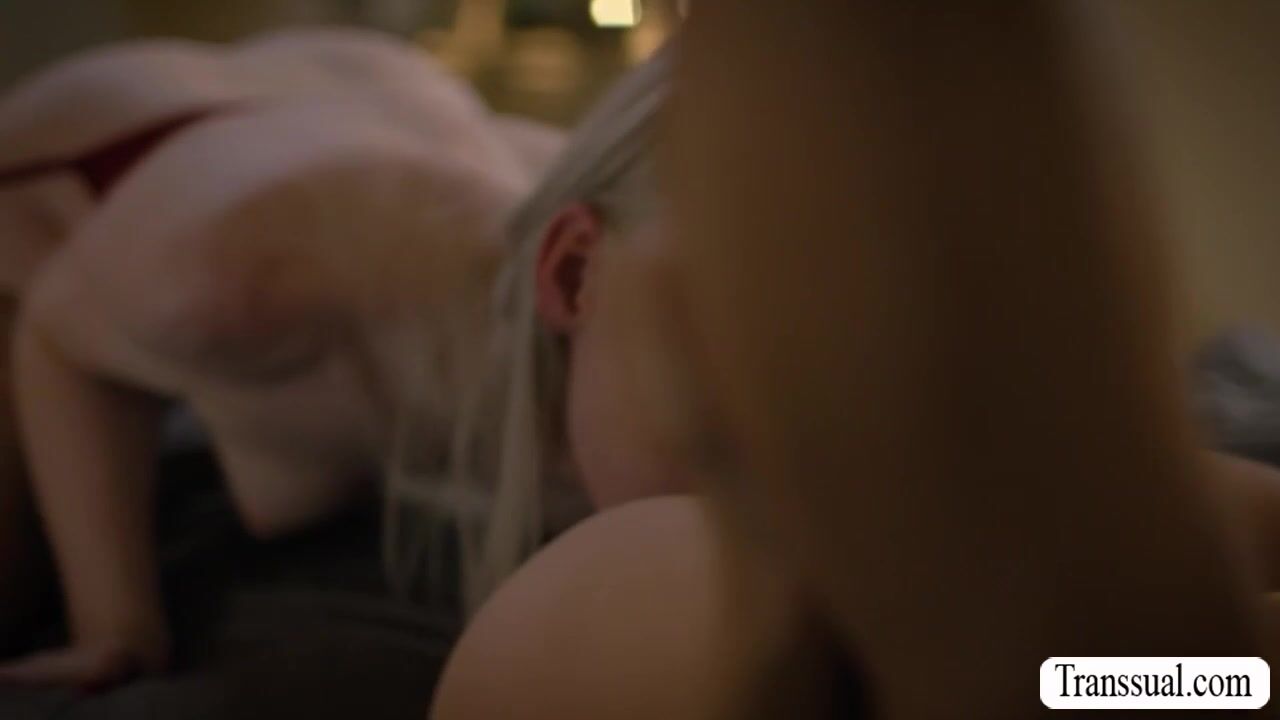 Smalltits blonde shemale is watching her self in the mirror and her hot friend arrives.They start kissing each other on the bed and she lets her slut friend suck her hard tranny cock passionately.In return,skinny TS licks and fucks her horny friend.