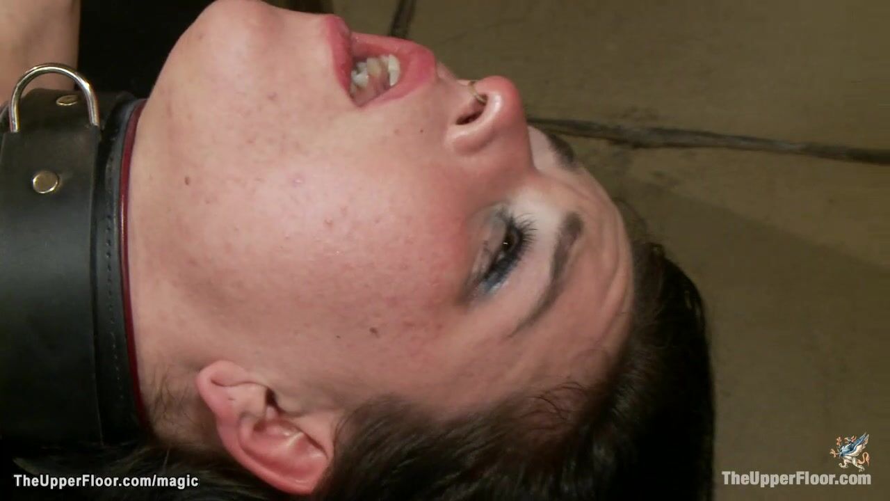 Strapped legs ebony babe Nikki Darling in pile driver position ass fucked with dick on a stick then petite brunette Juliette March rough banged too in the Upper Floor