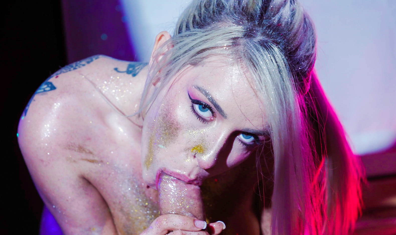 Marica knows how to have fun. All oily she wants to get covered in glitter. Just to make our man Emilio extra hard for a nice throating and riding.