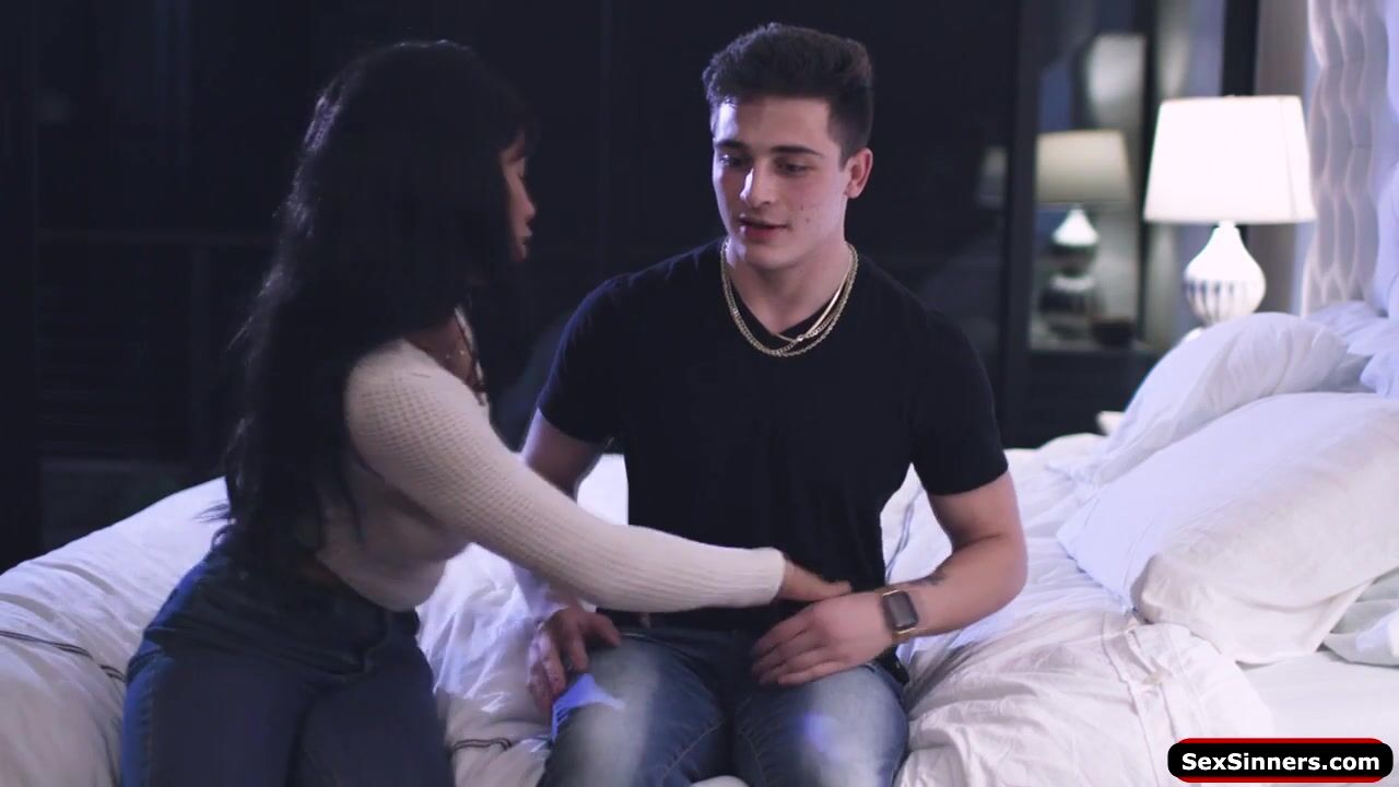 Ebony blindfolds a guy so her petite bff who has a crush on him can suck off his big cock.When he notices it the black babe goes downstairs so they can have sex.The brunette kisses him while giving a handjob and deepthroats.She rides on his big dick