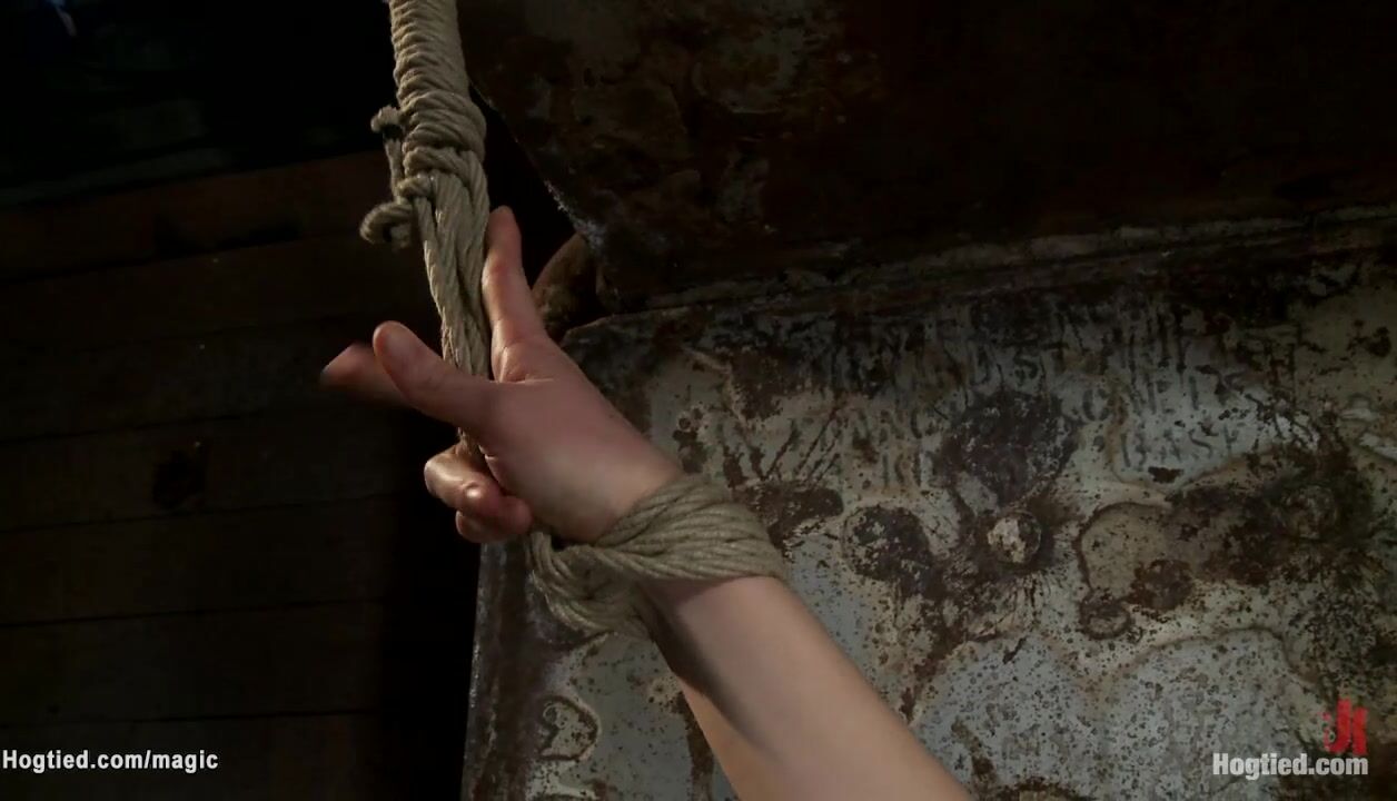 Master Matt Williams bound sexy brunette slave Mallory Mallone in standing position with hands spread then gagged her and clothes pinned and crotch roped on hogtied