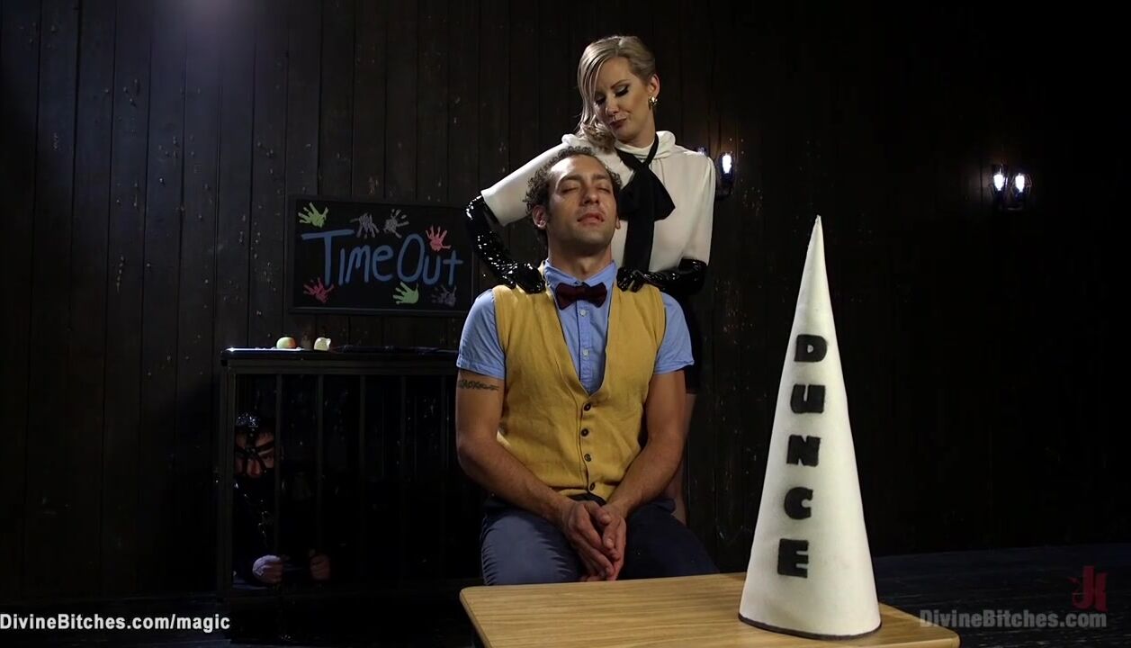 Slaveboy DJ returns to the Church of the Divine Bitches where sexy blonde femdom Maitresse Madeline Marlowe whips his ass then pegs him