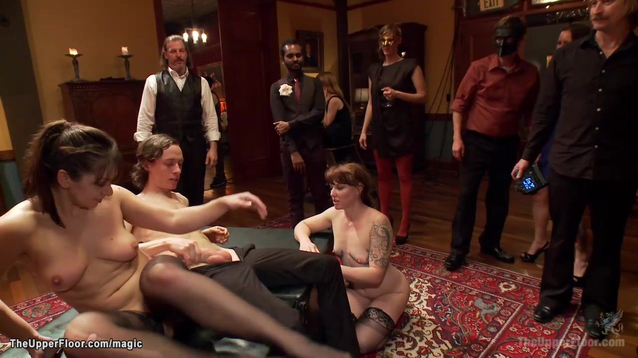 Horny slaves Lea Lexis and Krissy Lynn sucking huge dick then taking him in wet pussies till getting breasts jizzed at bdsm orgy party in the Upper Floor