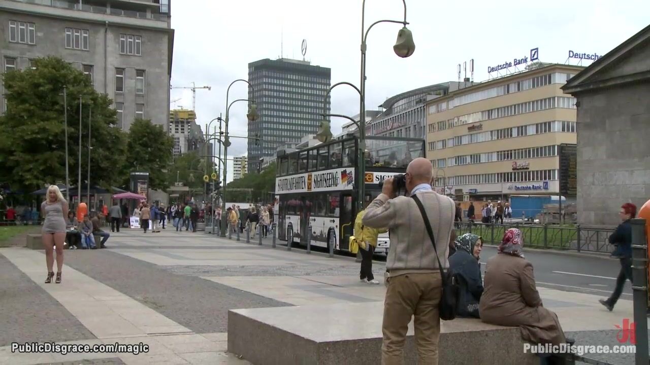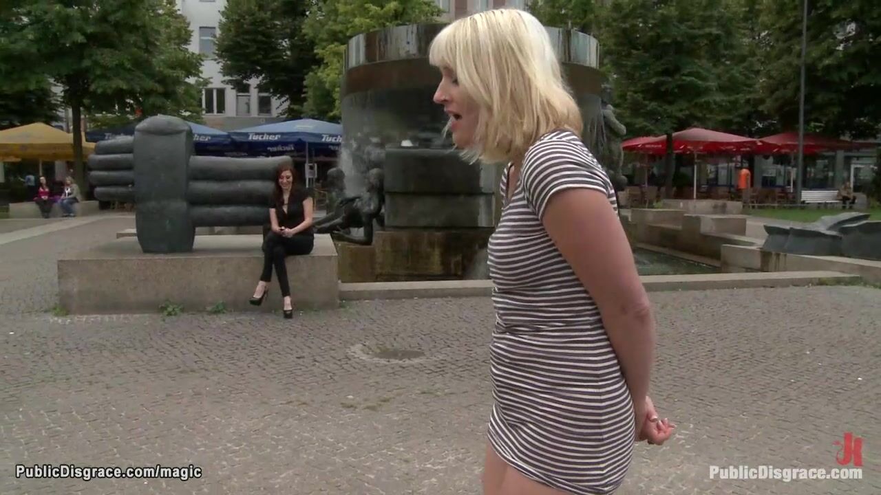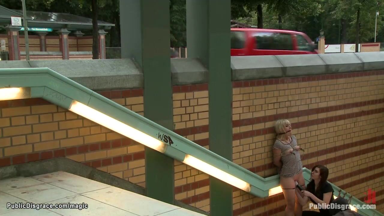 Pierced pussy German blonde babe Uma Masome takes electro shocks from remote in hands of lezdom Princess Donna Dolore in public street then fucked by huge dick at night
