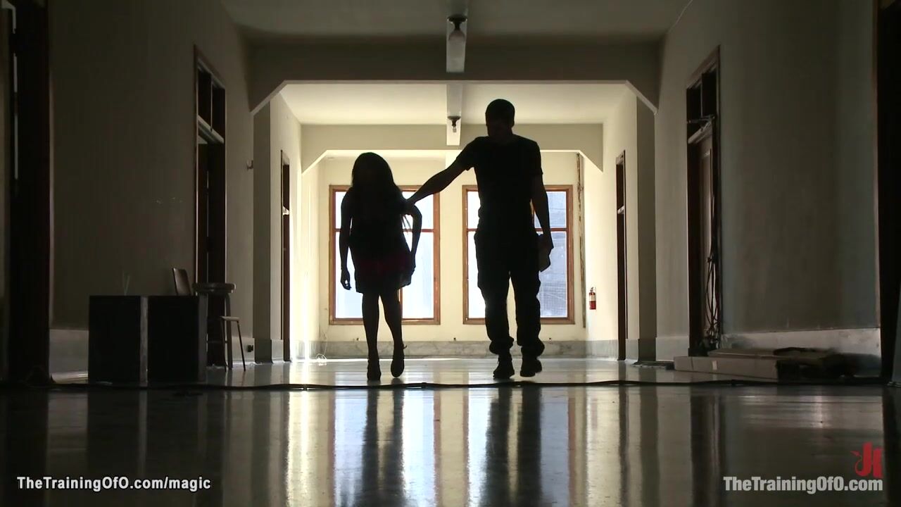 Tanned beautiful brunette slave Cassandra Nix is dragged by master James Mogul in dungeon where gets tied naked in high heels and whipped