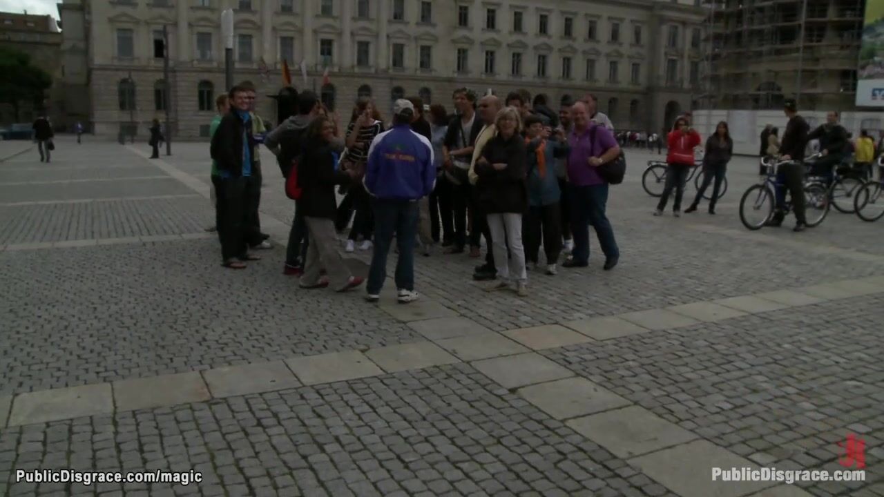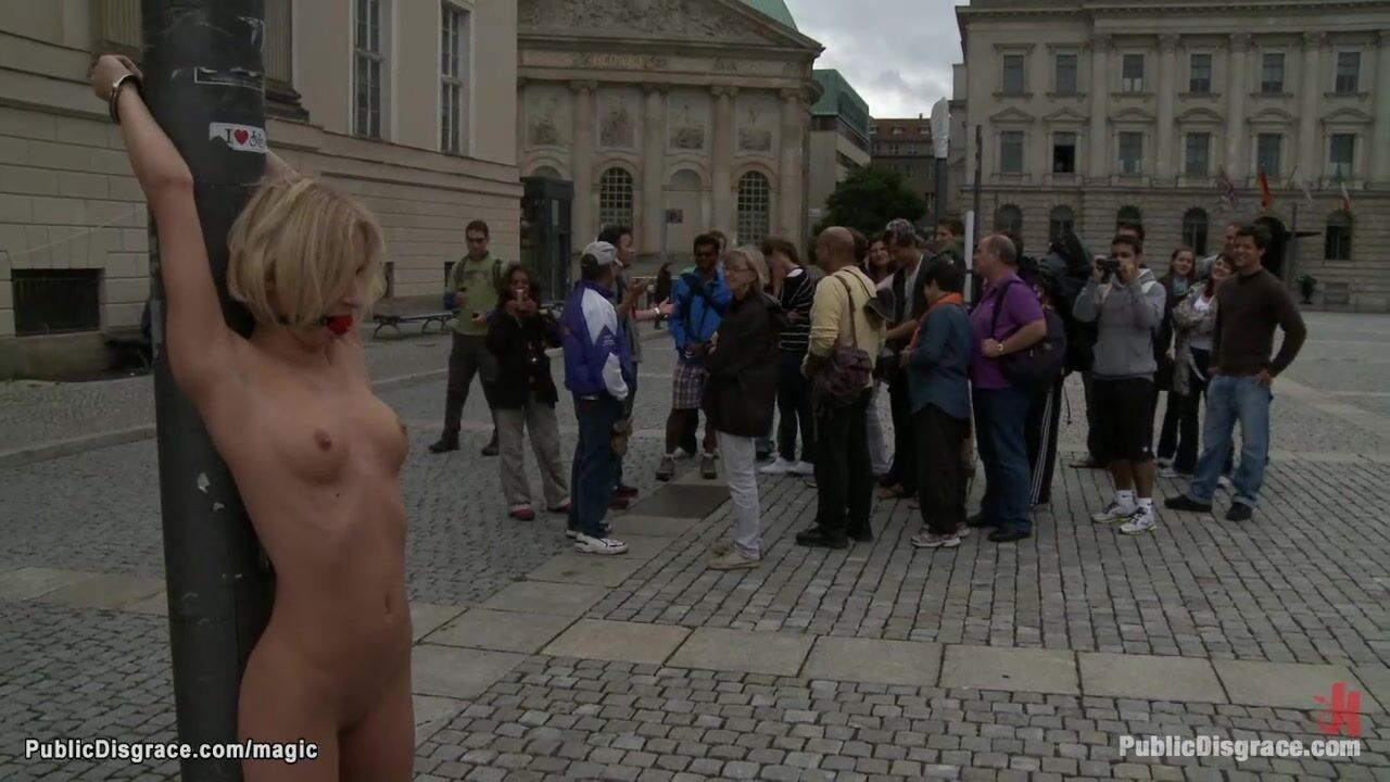 Naked blonde Euro babe Diana Pink in high heels is gagged and handcuffed to street lamp for onlookers then deep throat fucked by big cock Tommy Pistol