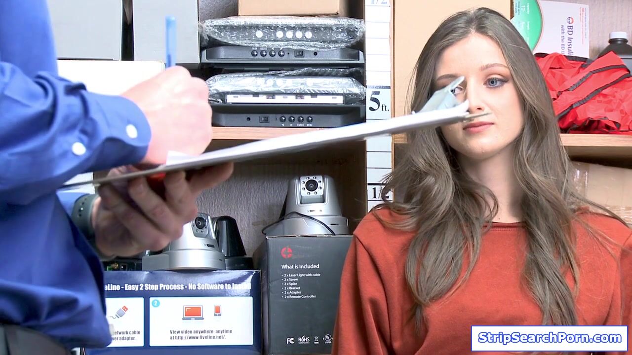 A store officer conducts strip search and then checks the teen shoplifters lingerie.Then he officer to let her go if she is willing to have sex.The brunette babe accepts the deal,blowjobs and deepthroats him then lets him fuck her shaved pussy.