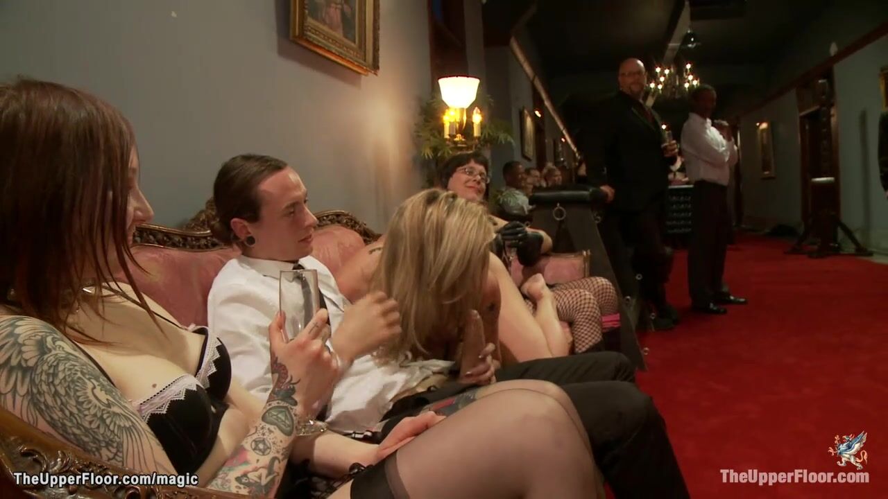 Maestro Stefanos and James Mogul discipline sexy blonde Dahlia Sky and big boobs brunette Penny Barber and make them suck and fuck big cocks at party in the Upper Floor