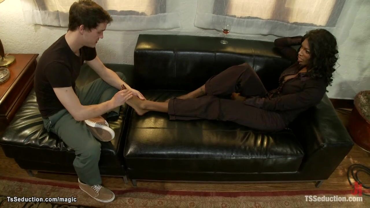 Ebony shemale Dean Natassia Dreams gets foot massage from student CJ then ties him and fucks in mouth and tight ass with big black cock