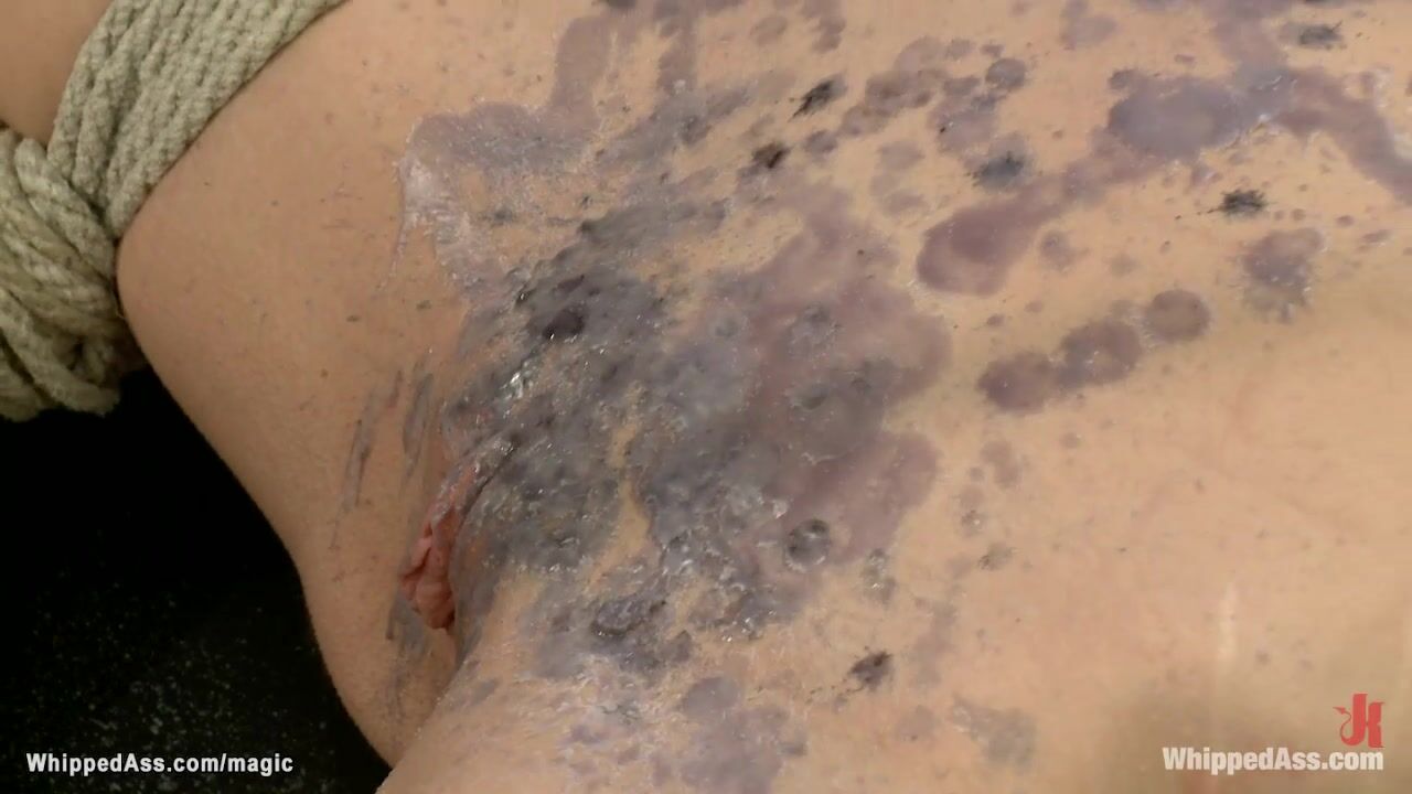 Lesbian slaves Brandy Aniston and Bryn Blayne bound on back one against other get hot wax and whip from big boobs lezdom Felony then they are fucked