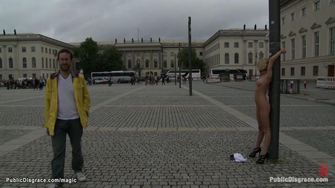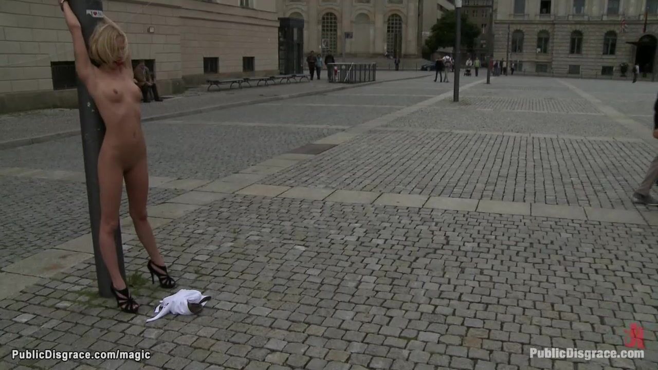 Naked blonde babe Diana Pink is gagged and bound in public for onlookers then gang bang fucked by big dicked men in different places