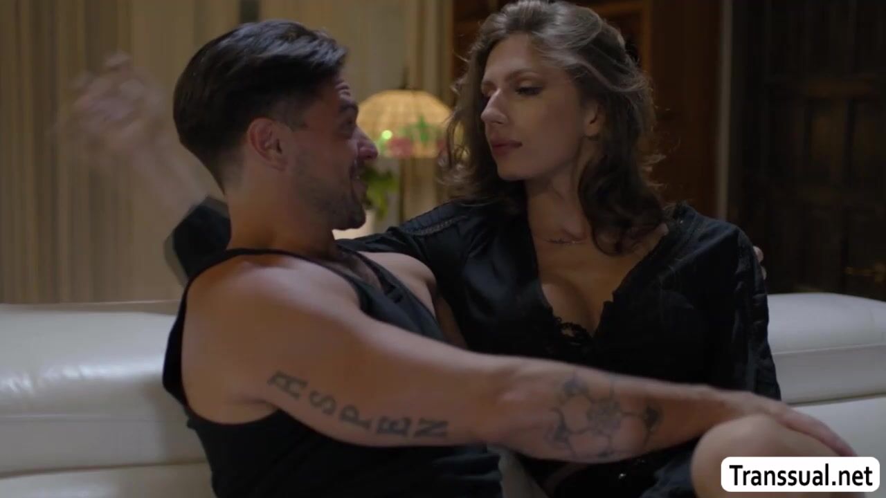 Busty TS lets her house cleaner sit on the couch with her and they start kissing each other.After that,she lets him suck her hard tranny cock passionately and in return,he licks and barebacks his tight wet ass so deep and hard.