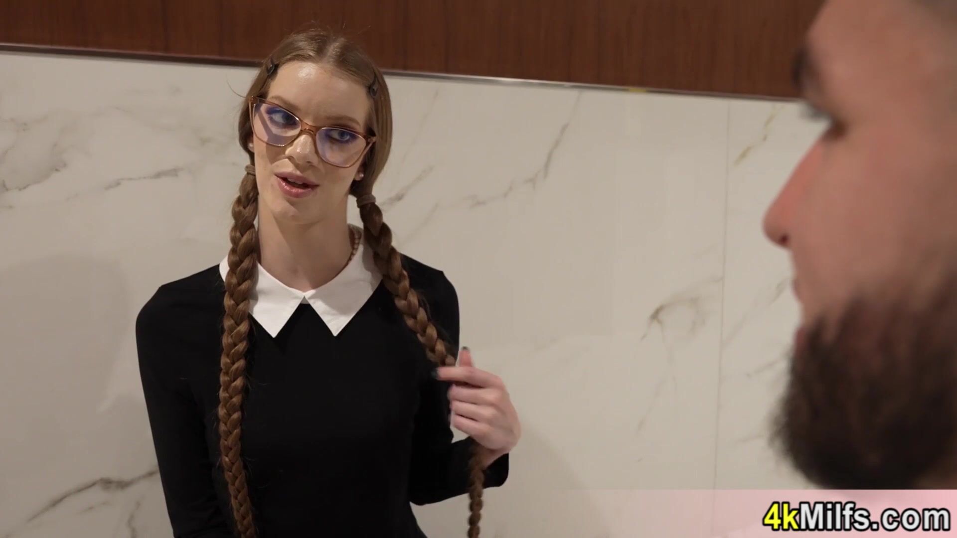 Dude seducing a nerdy brunette MILF Erine Everheart with small tits in glasses and offering a ride on his big cock to her The skinny slut cant resist the huge dick so gives him a blowjob and lets him to fuck her trimmed pussy gently