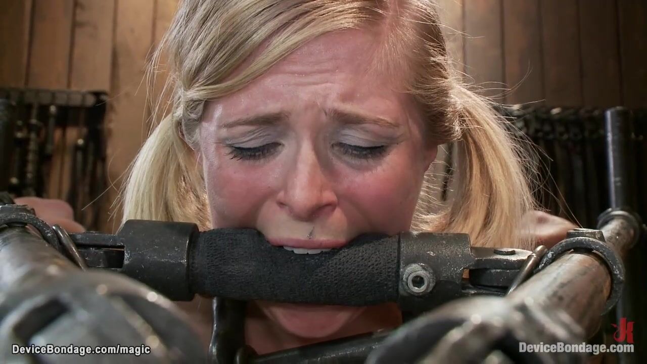 Bound and gagged blonde lesbian slave Penny Pax gets boobs tazappered then bent over and strapped in strappado position gets vibed by lezdom Claire Adams on device bondage