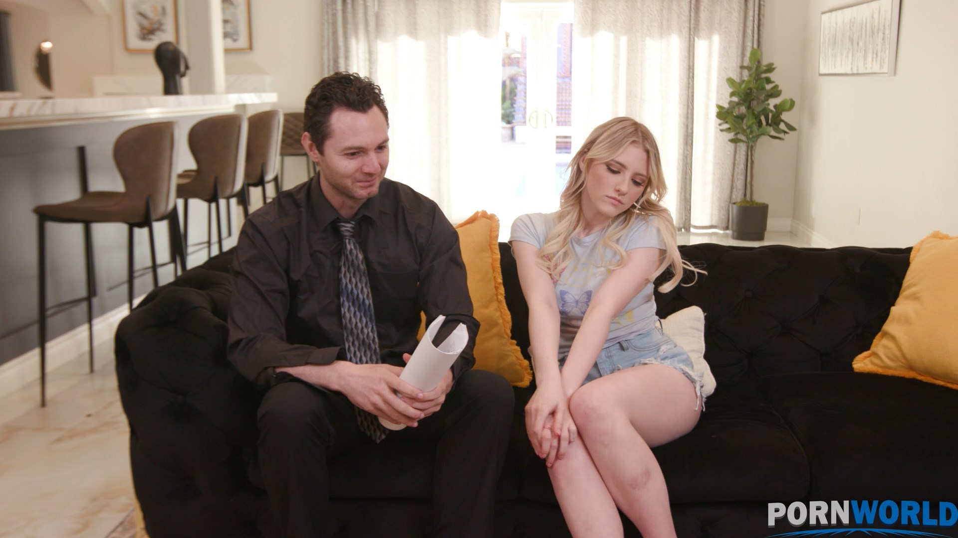 Teen girl watching japanese porn while salesman knock the door