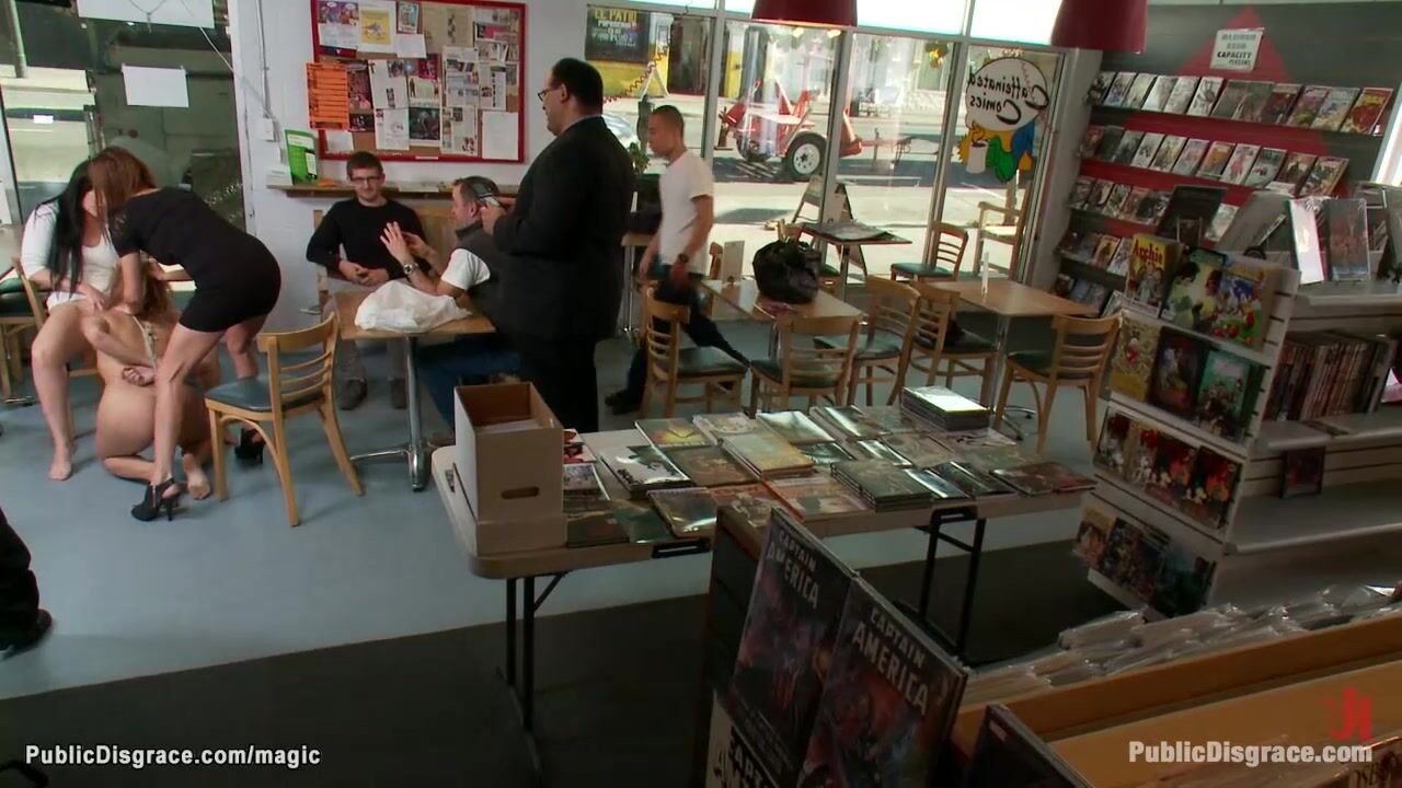 Princess Donna Dolore and big cock master James Deen fuck in the ass and mouth with big dick and strap on sexy slut Ashlynn Leigh in public comic book store