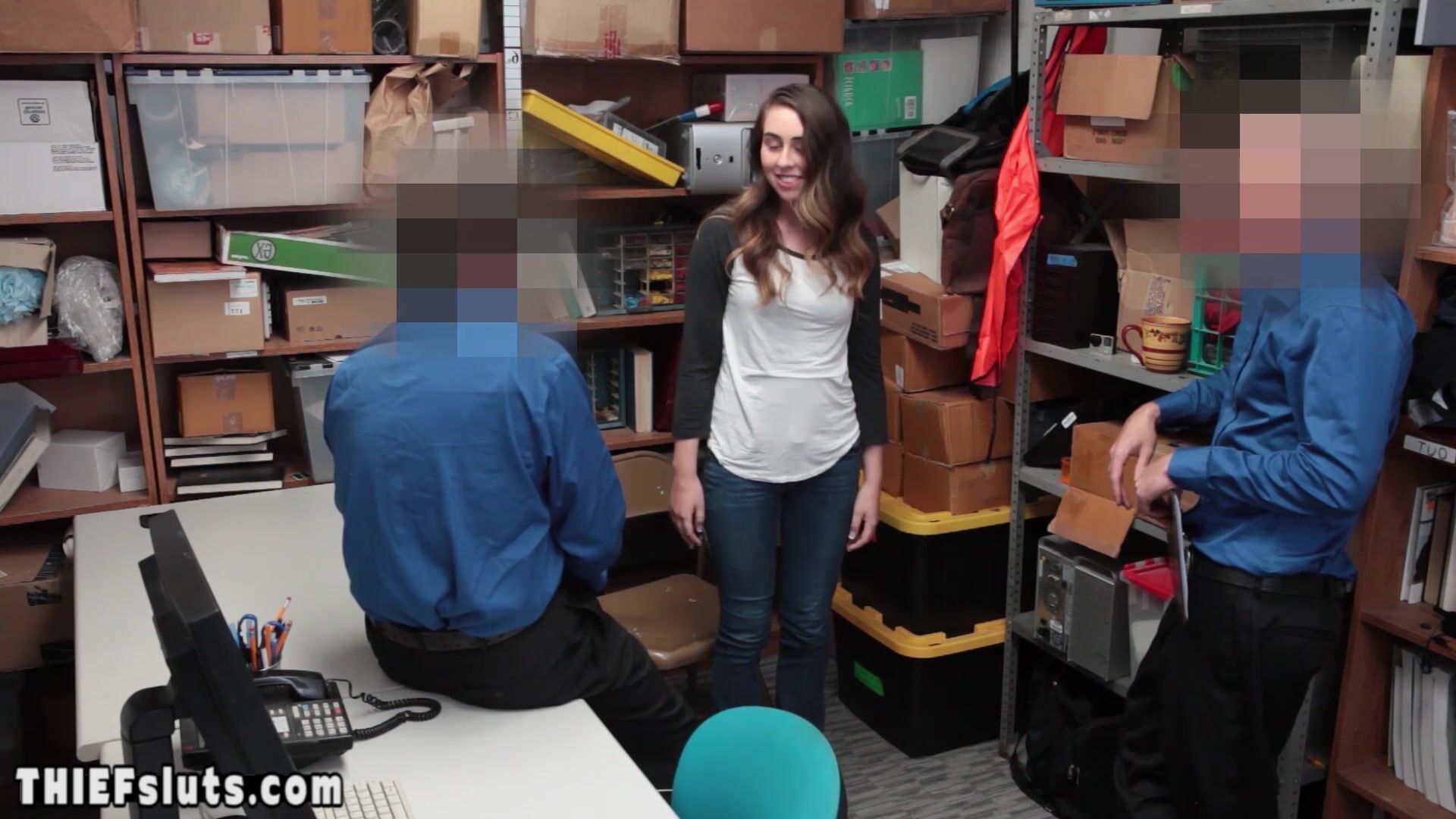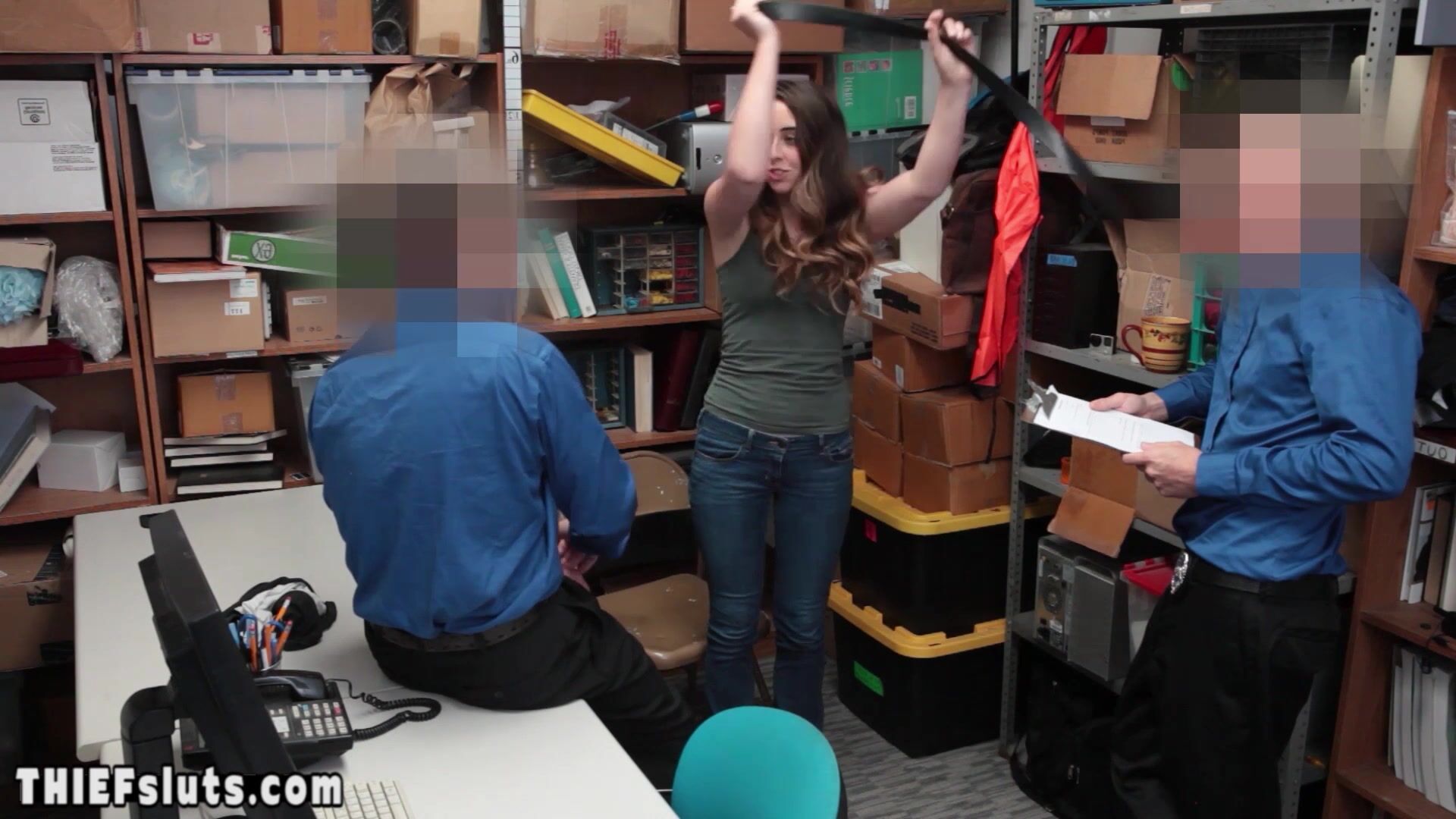 Hot brunette teen shoplifter Lexi Lowel with big natural tits has to suck a dirty LP officers big dick during his partner fucking her shaved pussy after the interrogation