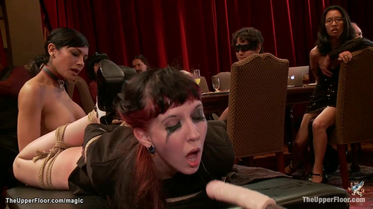 Big tits bound chef Nerine Mechanique is laid on table and fucked with dick on a stick then fucked by big cock togehter with other slaves at orgy party in the Upper Floor