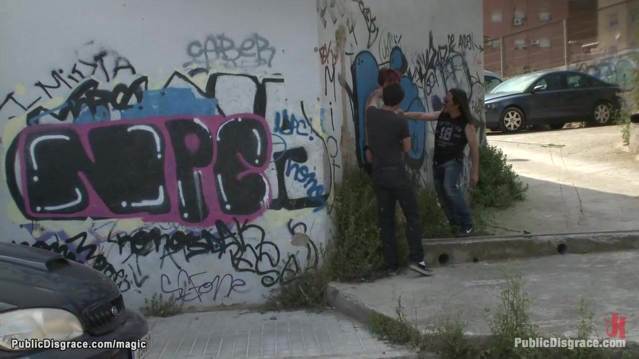 Beautiful redhead European babe Yakima Squaw gets deep throat fucked outdoor in public then spanked by strangers and walked naked for onlookers by master James Deen