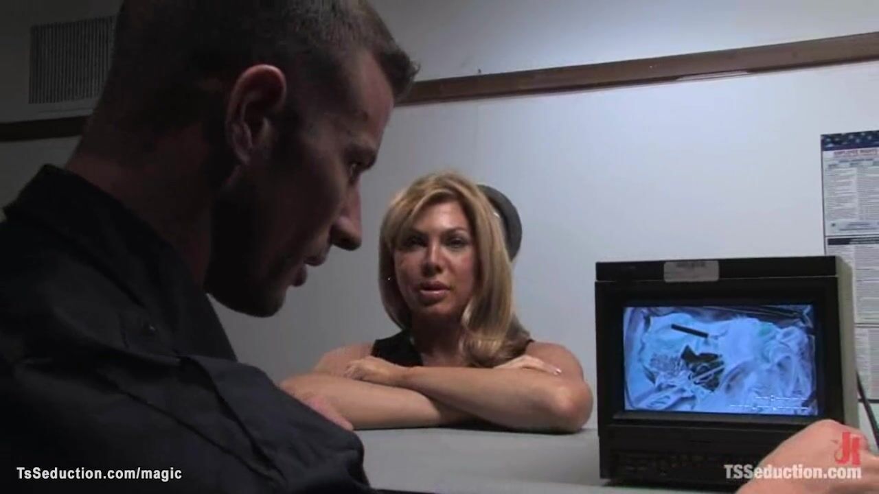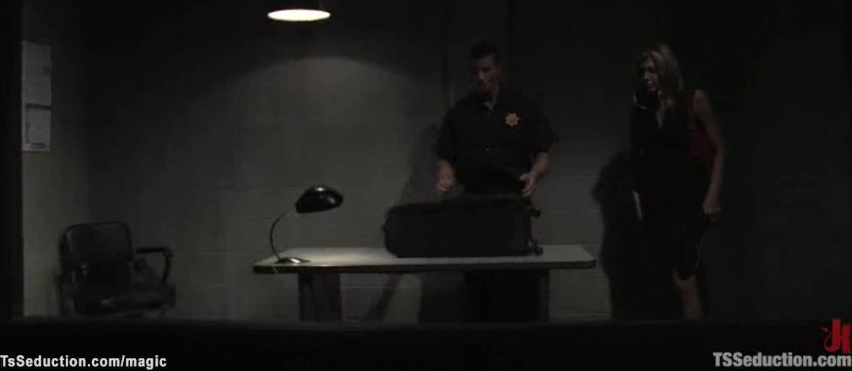 Airport security guy Rusty Stevens searches bags to big tits blonde MILF tranny Carmen Cruz but she cuffs him and anal fucks bent over table in his office