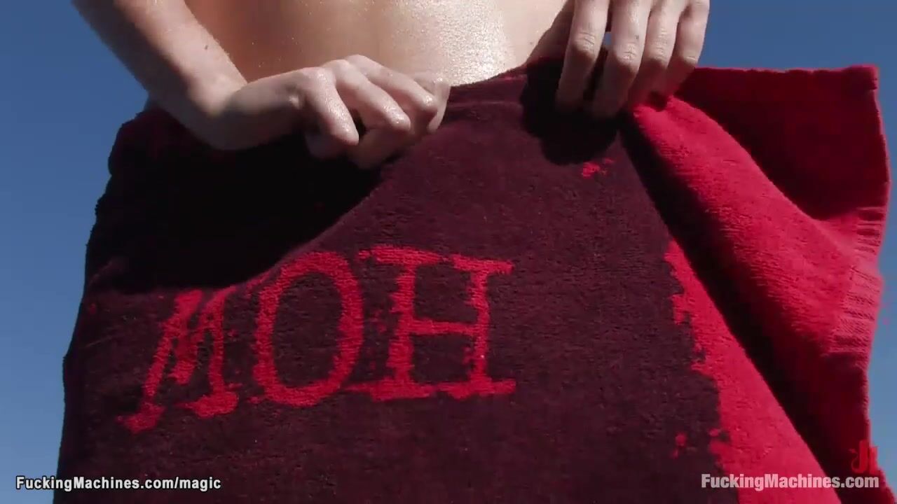 Natural busty blonde babe Kissy Kapri gets horny on the beach and she moves in her camper where fucks double penetration machine and vibrator solo