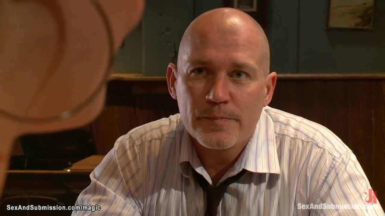Wealthy old stranger Mark Davis binds huge boobs blonde bartender Katie Kox on table and fucks her face then bangs her pussy from behind while she is bound to the chair