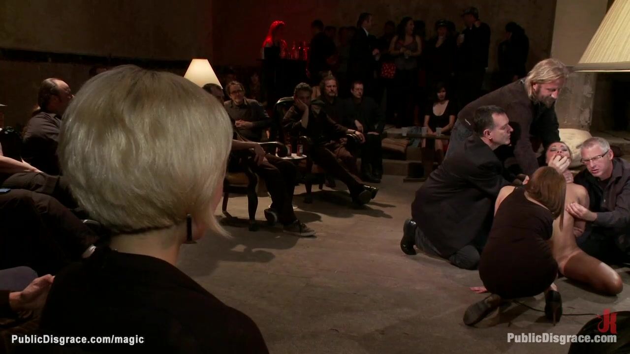 Pretty skinny ebony slave Skin Diamond gets vibed and slapped and feet caned by Princess Donna Dolore then gang bang fucked by big cocks in public