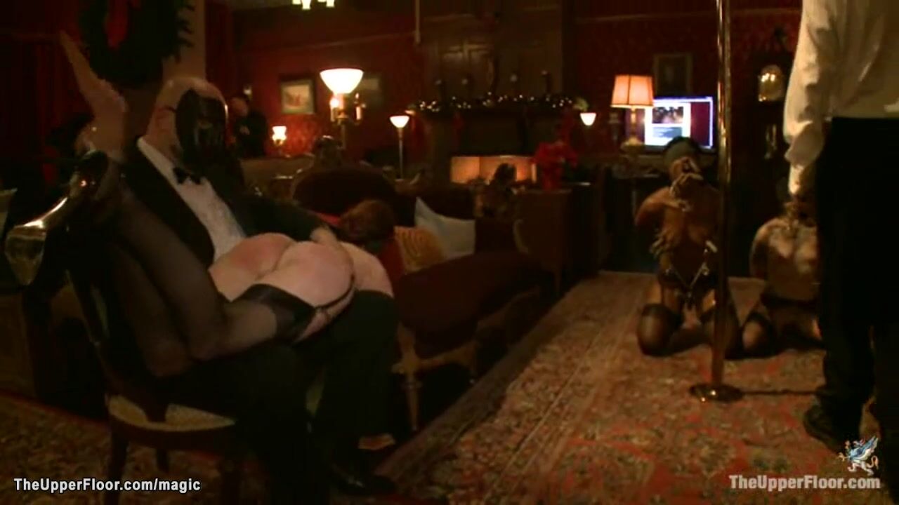 Hot ebony slave Coffee Brown and tattooed brunette Sparky Sin Claire are blindfolded and clamped then mouths fucked by big dick at bdsm party in the Upper Floor