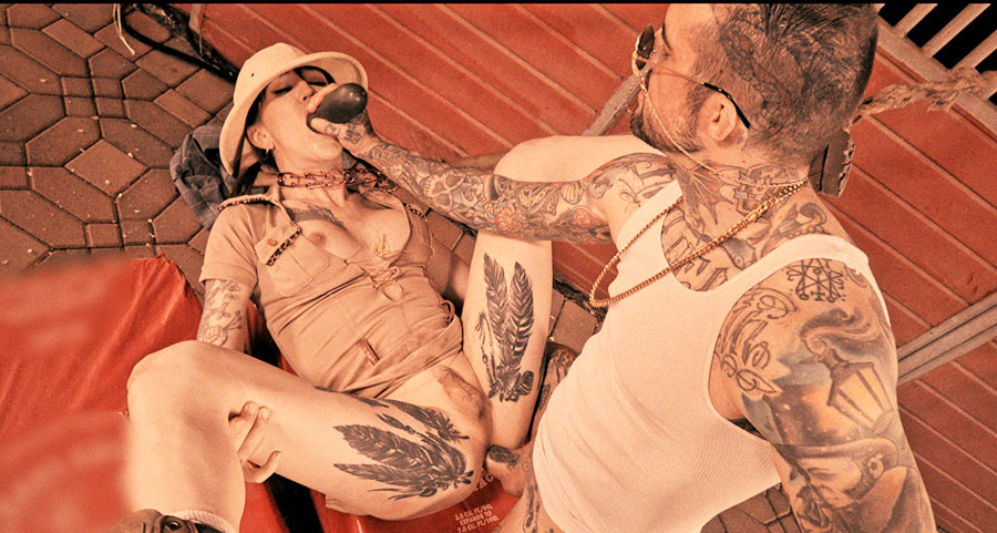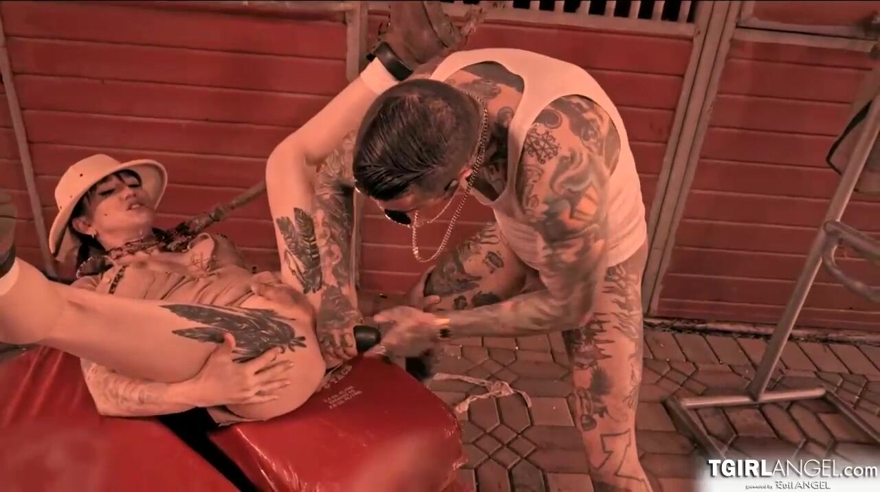 Busty tattooed shemale Lena Moon wears a cute safari hat as she scouts for thick cock.Stud Hell4slootz fucks her face with his big cock.The ts bouncing as Hell4slootz drills her eager ass and slips a thin black rod inside her ass as he buttfucks her
