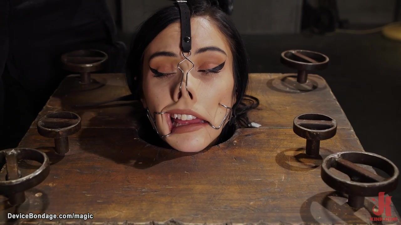 Bound in bondage cube with neck trapped brunette slave Jazmin Luv gets pussy vibed then in other positions pussy finger fucked by master The Pope on device bondage