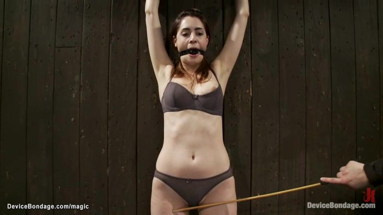 Gagged brunette slave Lori Adorable in underwear gets ankles and wrists locked in wooden stocks on the wall gets caned then mounted on sybian on knees by master Orlando on device bondage