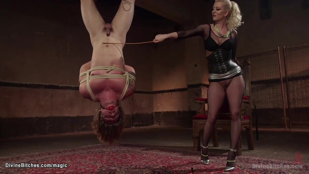 Big tits blonde femdom Cherry Torn canes and whips bound and gagged Tom Faulk in upside down suspension then pegs him bent over and rides dildo gag above his face