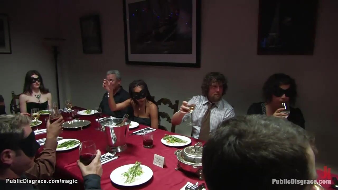 Princess Donna Dolore hosts dinner party and makes hot naked brunette slave with huge tits Charley Chase serve then gang bang fuck big cocks for public