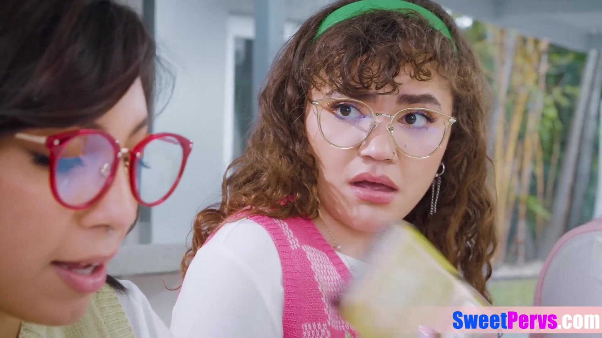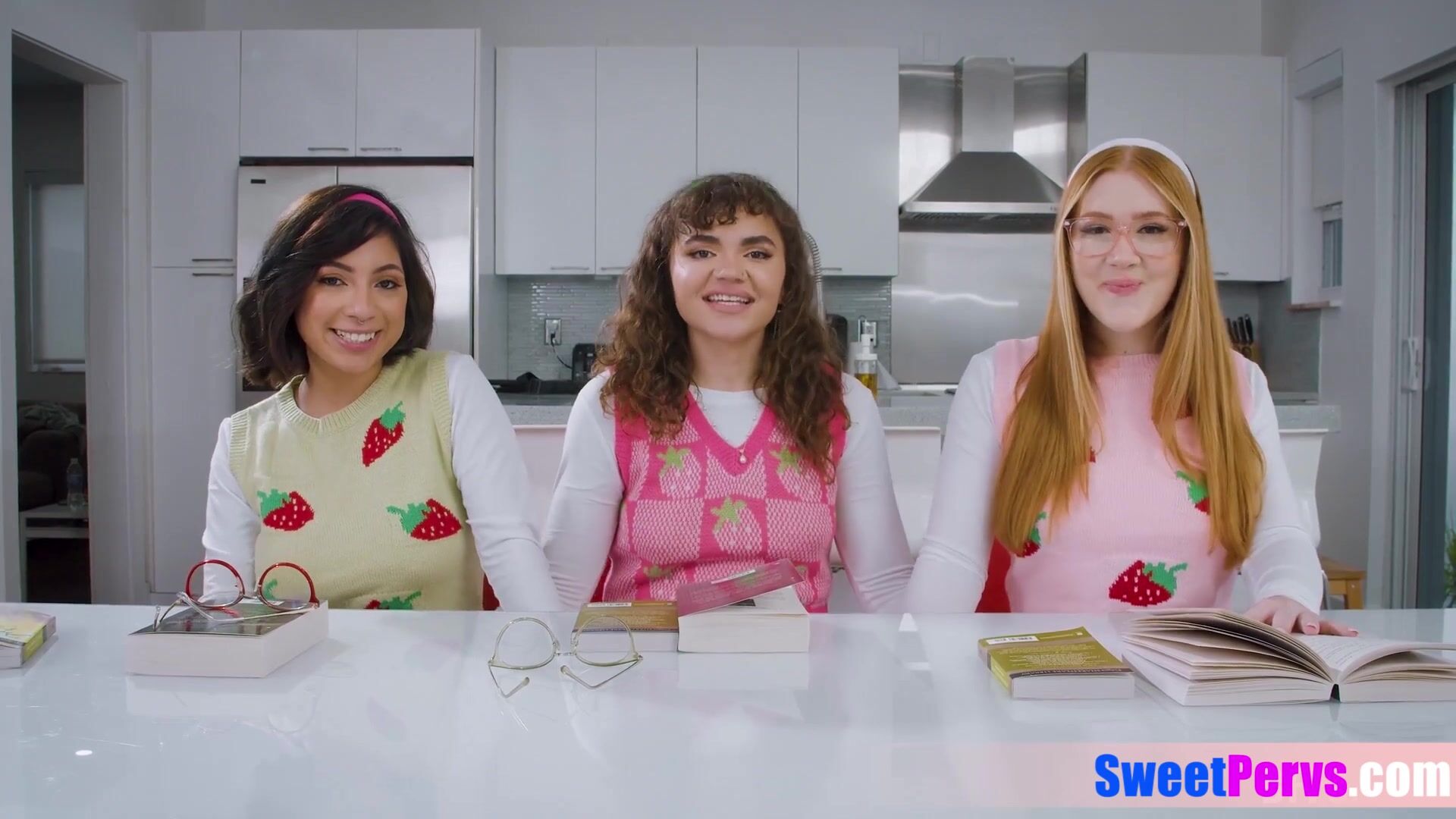 Bookworm latina teen and her BFFs discussing on a big cock