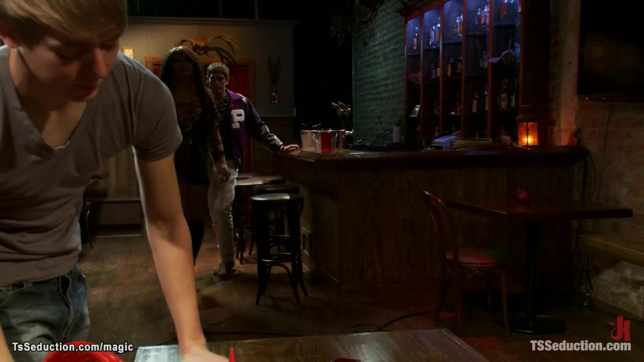 College althletes Koby Fox and Robert Bridges are bound by big tits Asian shemale bartender Yasmin Lee and anal fucked then made fuck her with big cocks