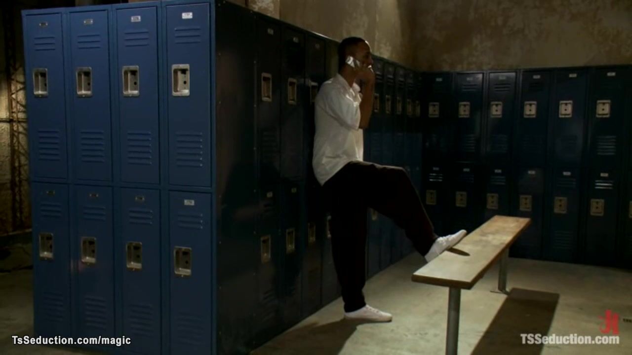 Heac Chef Latina shemale Jessica Host harrasses black student chef Kurt Connors and sucks his dick then fucks him in mouth in locker room
