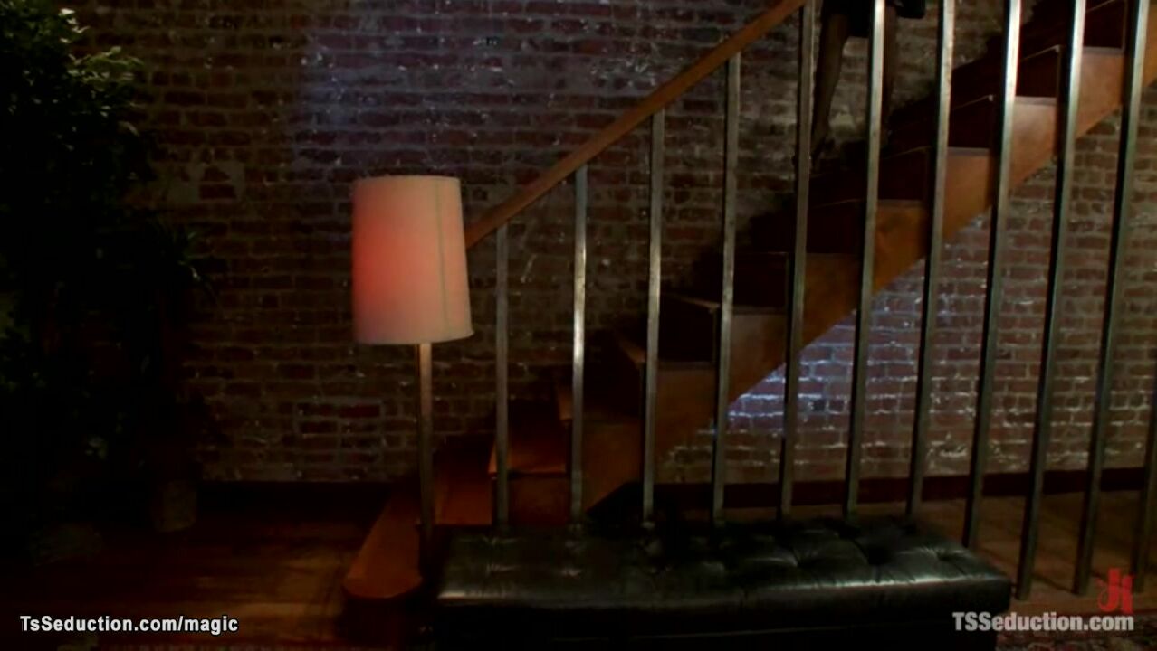 Big tits blonde shemale lady Paris A seduces courier John Jammen then gives him footjob in stockings till handcuffs and anal fucks him on the couch