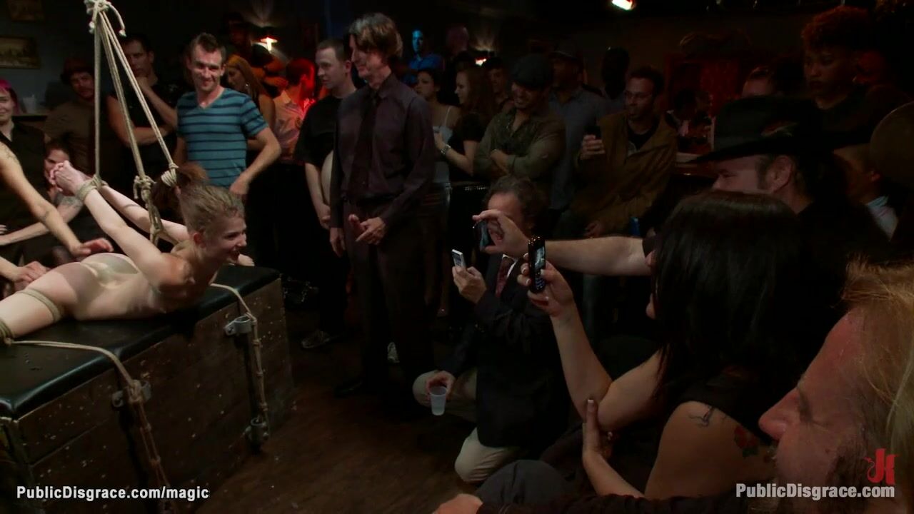 Flexible gagged slave Sensi Pearl with one leg in the air and bound to neck gets pussy fucked then gang bang fucked and face cummed in crowded public place