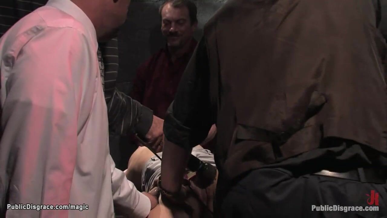 Blonde teen Ally Ann bound in back arch position and gets groped then mouth fucked till gang banged in bondage in dark public club by big cocks