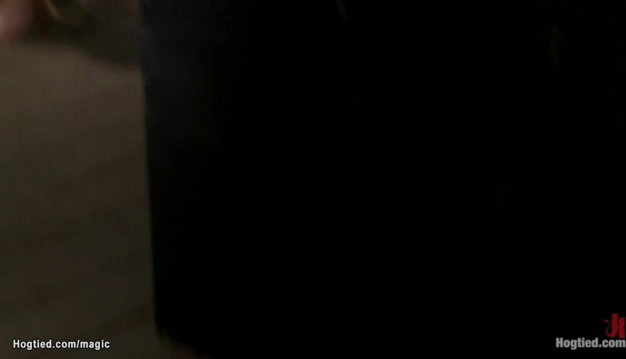 Big tits blonde slave Lorelei Lee gets nylon hose over her face then gets blindfolded and gagged with black tape and bound to the wooden wall by group of masters
